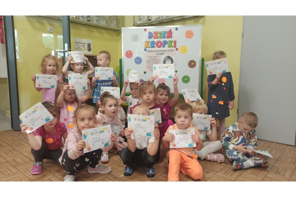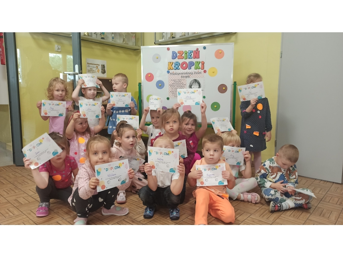 Międzynarodowy Dzień Kropki to święto, które od 2008 roku stwarza okazję do budowania pewności siebie, odkrywania talentów i pobudzania wyobraźni dzieci, młodzieży i dorosłych. Obchodzimy je 15 września. W naszym przedszkolu w tym dniu wszyscy mieli na sobie ten popularny wzór. Były sukienki w kropeczki, koszulki, bluzy, spodnie, rajstopki, kokardki we włosach, a kto nie zdążył się przygotować w domu- dostał kolorowe kropki do naklejenia na ubranie. Niektóre mamy odkryły swoje talenty i same namalowały na bluzeczkach kropki. Były kropkowe zabawy, piosenki, rysunki i przede wszystkim czytanie książki Petera H. Reynoldsa „The Dot” czyli “Kropka”.