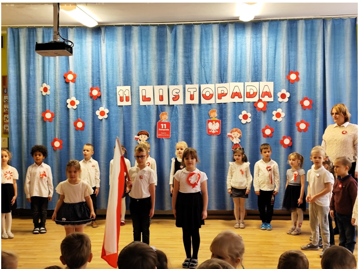 5 listopada w naszym przedszkolu odbyła się uroczystość z okazji 107 rocznicy odzyskania przez Polskę niepodległości. Przedszkole w tym dniu przybrało biało-czerwone barwy, a dzieci przyszły ubrane w odświętne stroje. Najstarsza grupa zaprosiła młodszych kolegów na poranek patriotyczny. Na początku wszyscy obecni odśpiewali hymn państwowy. W swoim występie "Sówki" wyjaśniły, co to znaczy niepodległość, zaprezentowały nasze symbole narodowe, tańce, piosenki, wiersze w tematyce patriotycznej. Młodsze przedszkolaki również pokazały swoje umiejętności. W ramach akcji "Szkoła do hymnu" w piątek o 11:11 cała społeczność przedszkola śpiewała hymn państwowy.