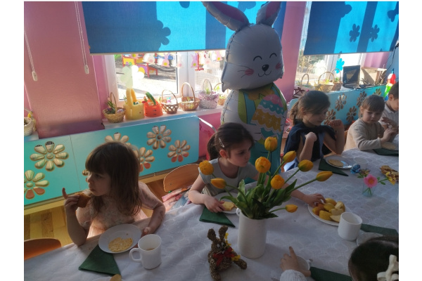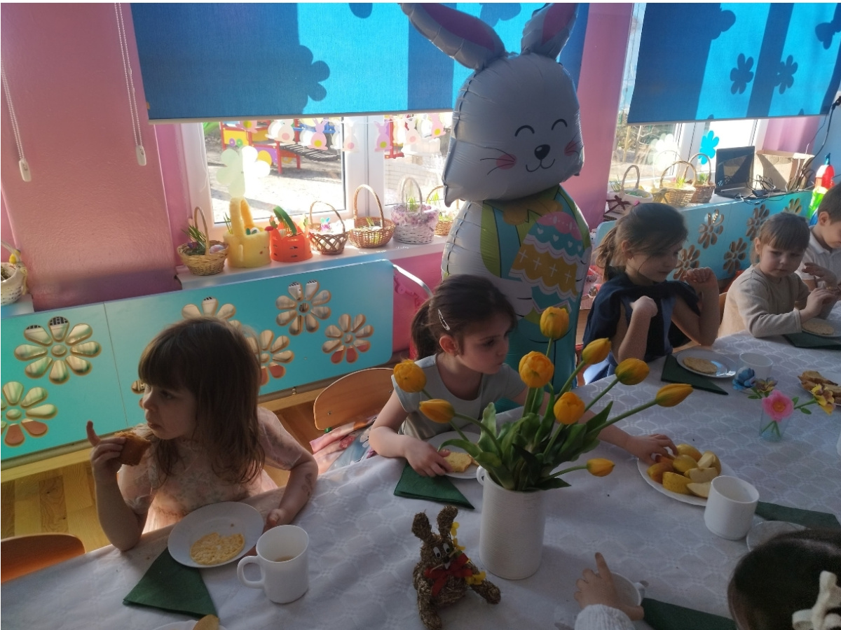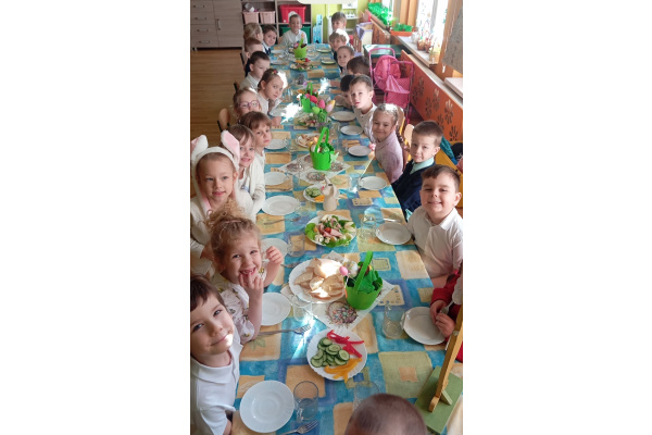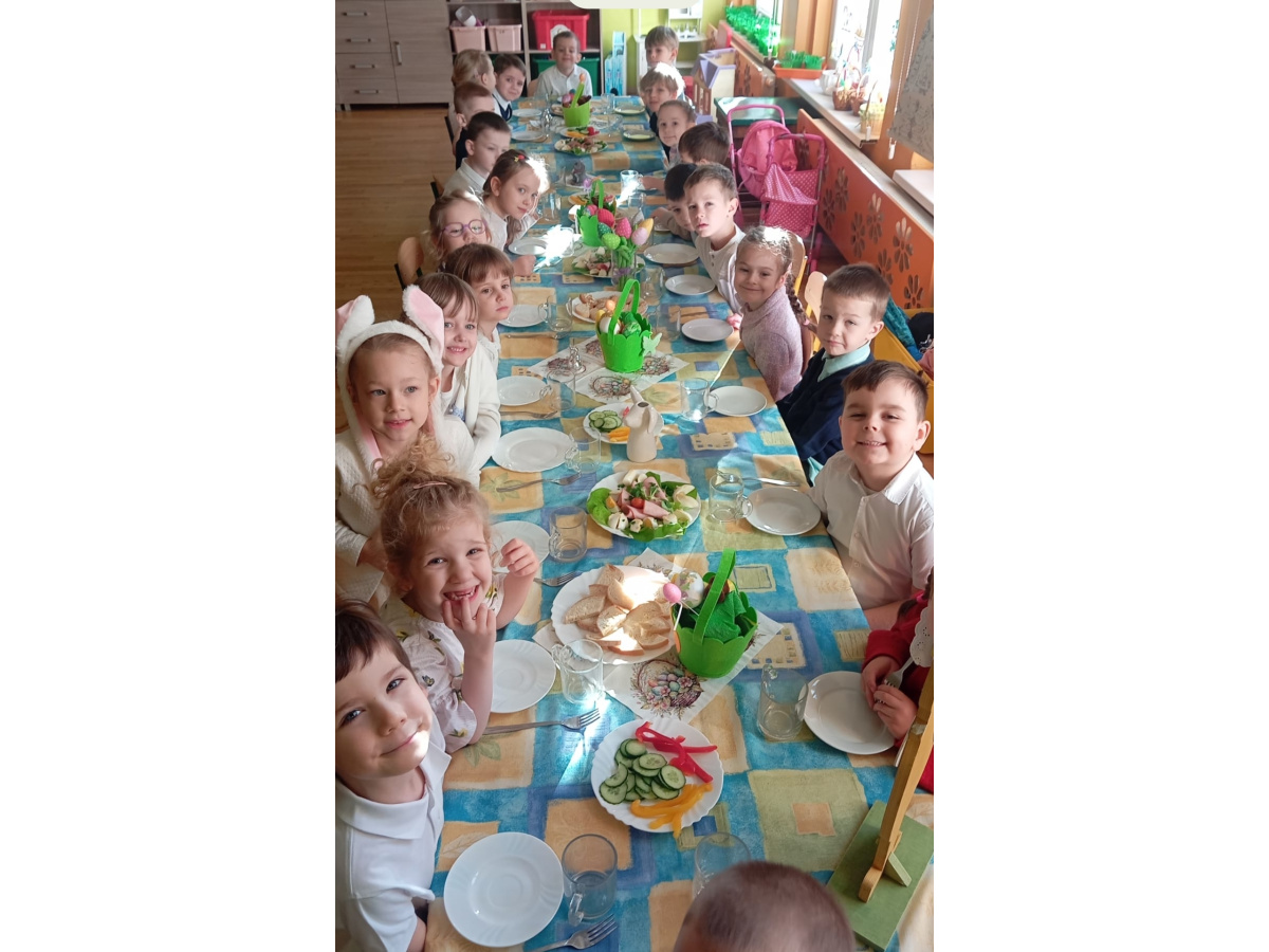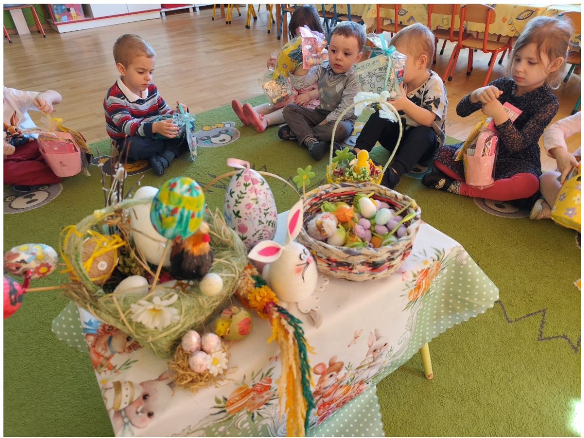 W naszym przedszkolu zapanowała prawdziwie świąteczna atmosfera. Dzieci z radością uczestniczyły w świątecznym śniadaniu i obiedzie wielkanocnym, podczas których na stołach pojawiły się tradycyjne wielkanocne potrawy. Przed świętami przedszkolaki z wielkim zaangażowaniem przygotowywały własnoręczne koszyczki wielkanocne. Każdy z nich był wyjątkowy – pełen kolorów, pisanek, kurczaczków, zajączków i wiosennych motywów.