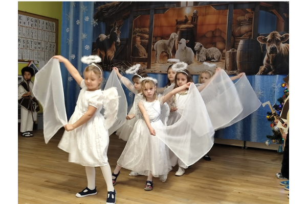 Z okazji zbliżających się Świąt Bożego Narodzenia dzieci i pracownicy przedszkola spotkali się na uroczystości przygotowanej przez najstarszą grupę. Pracowite Skrzaty zaprosiły wszystkich do obejrzenia programu artystycznego oraz wspólnego śpiewania kolęd. Święty Mikołaj w tym dniu rozdawał przedszkolakom prezenty. Podczas posiłków dzieci próbowały wigilijnych potraw. Było bardzo uroczyście i nastrojowo.